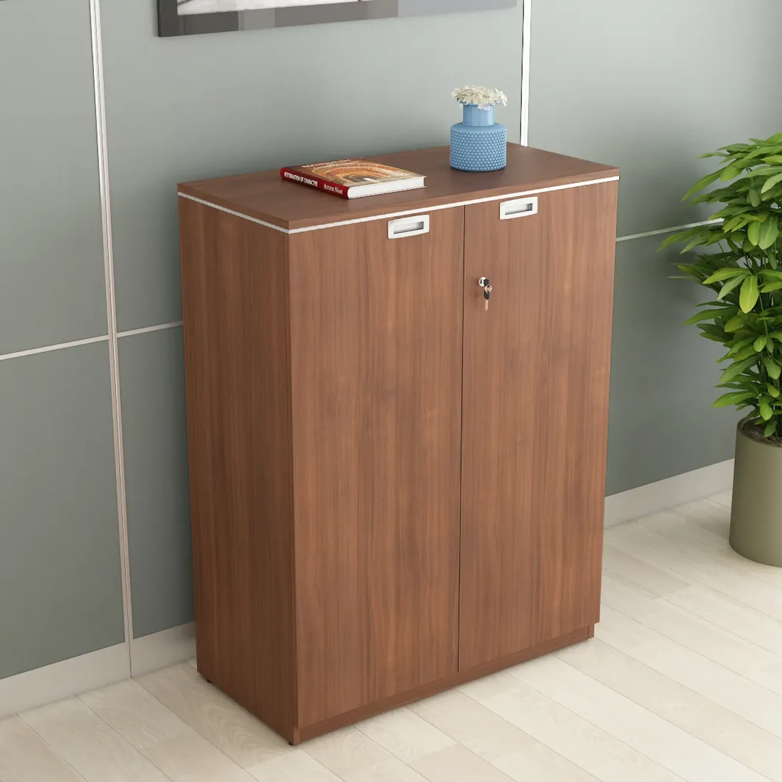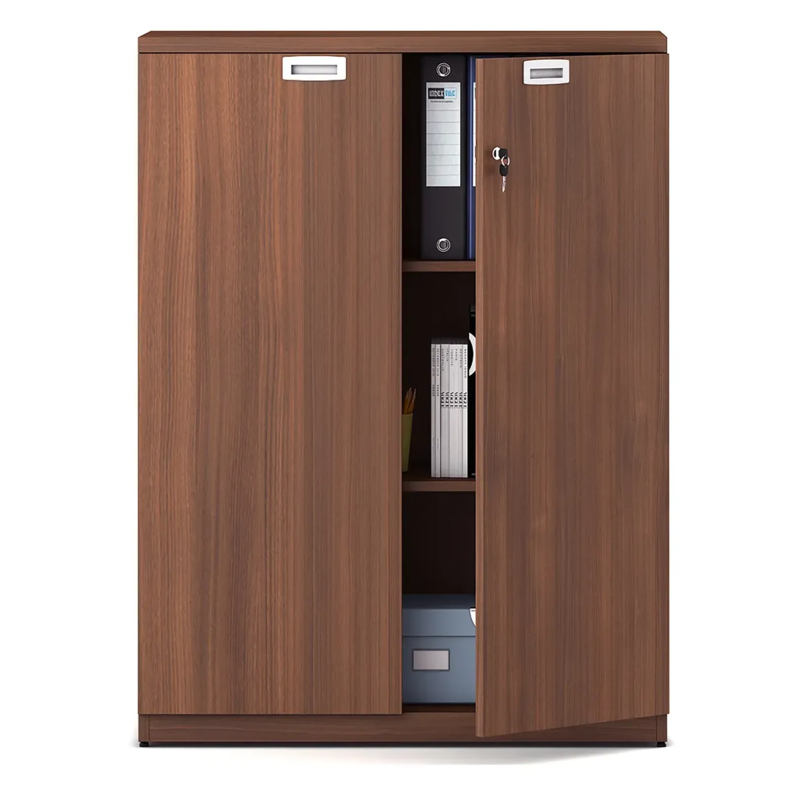 Provision of lock with tower bolt for two shutters .Flush type pull handles are fitted on shutters. Provision of adjustable shelf for better placement of files and records.