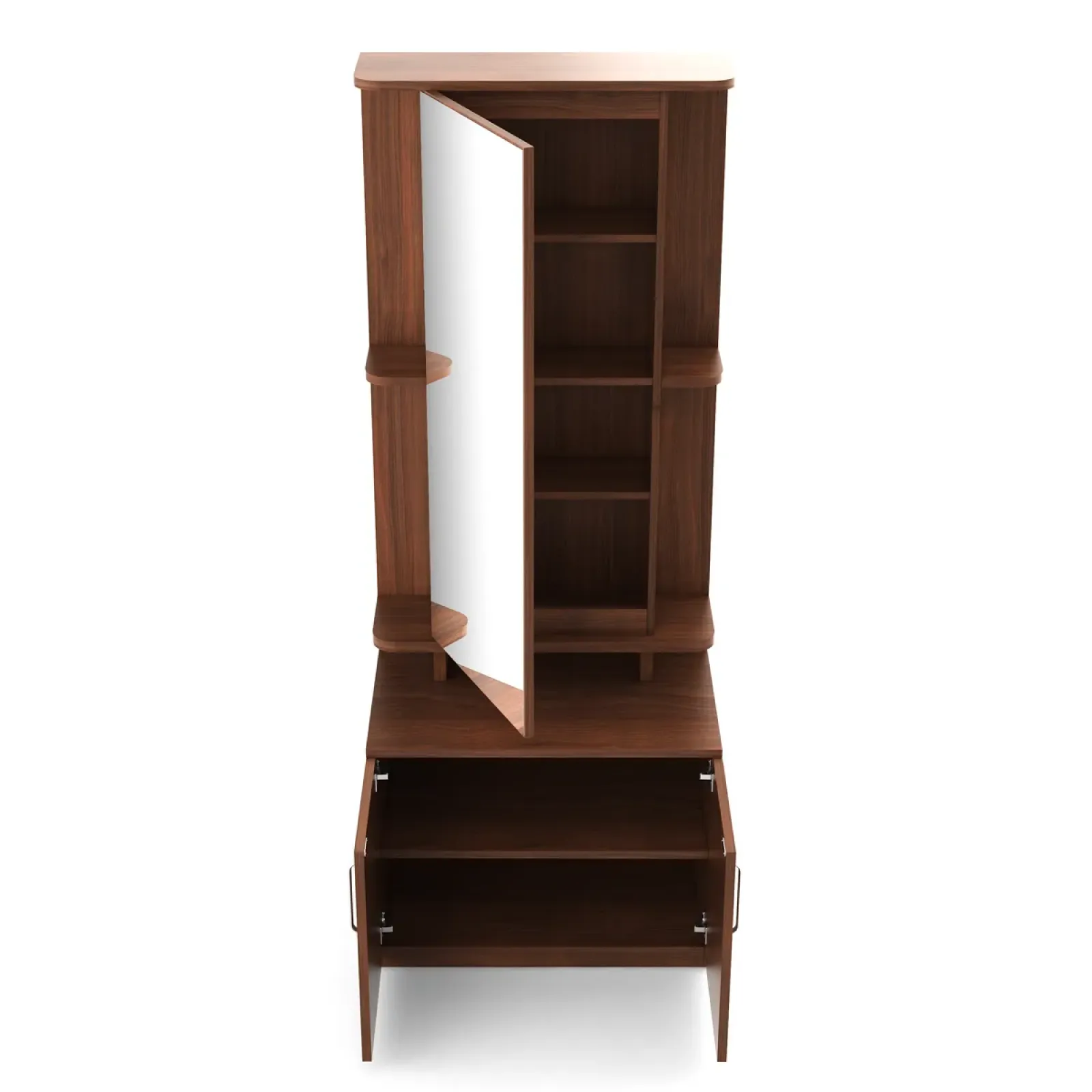 - Dressing Table Ora - Walnut Rigato Woodpore is a seamless combination of utility and aesthetics, designed to elevate your personal grooming space. Featuring a sleek mirror, spacious drawers, and an ergonomic layout, it offers ample storage for cosmetics, accessories, and essentials.