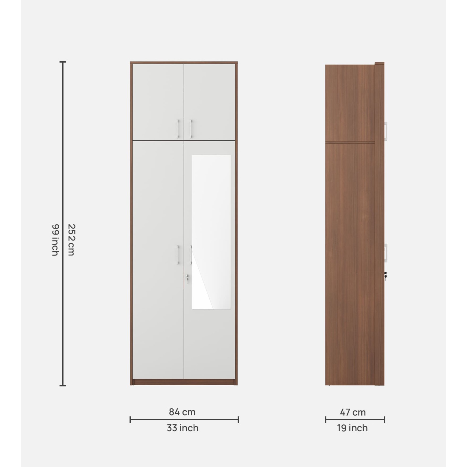 - DEW 2 DOOR WARDROBE FW SHUTTER MIRROR WITH LOFT - WALNUT RIGATO is a sleek and functional storage unit designed to offer ample space for organizing clothes, accessories, and personal belongings while maintaining a stylish aesthetic. This wardrobe type is ideal for medium-sized rooms, providing an optimal balance between compact design and spacious storage.