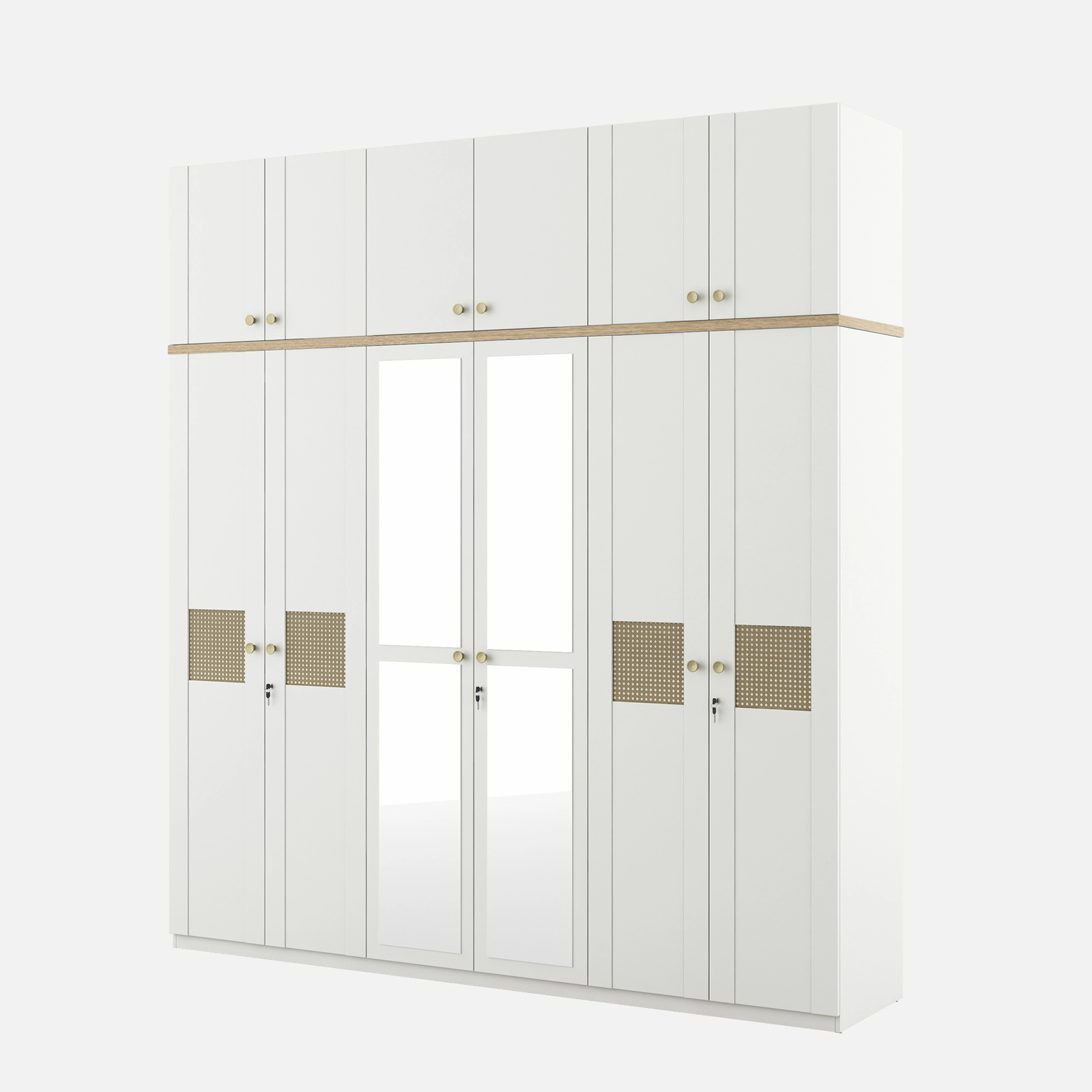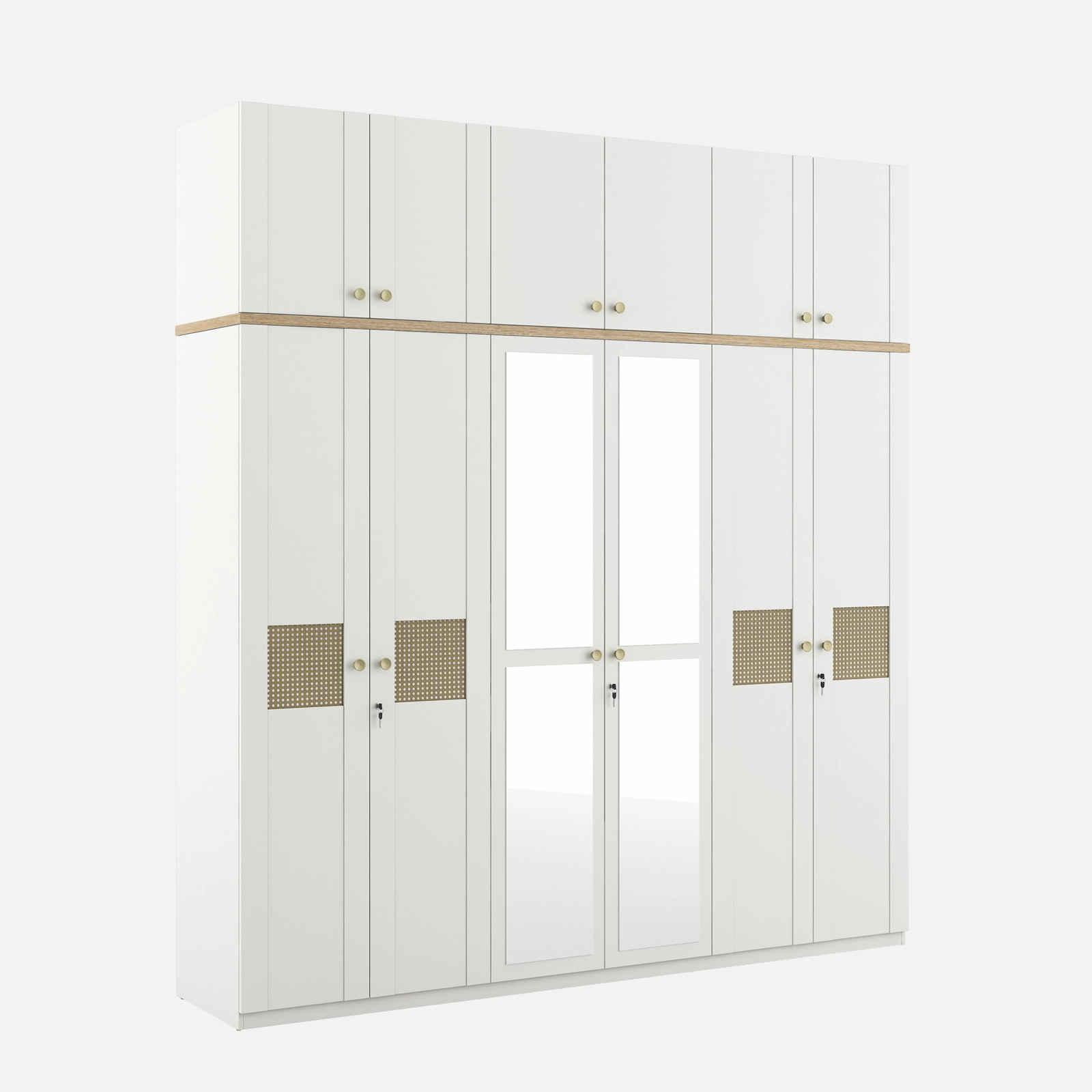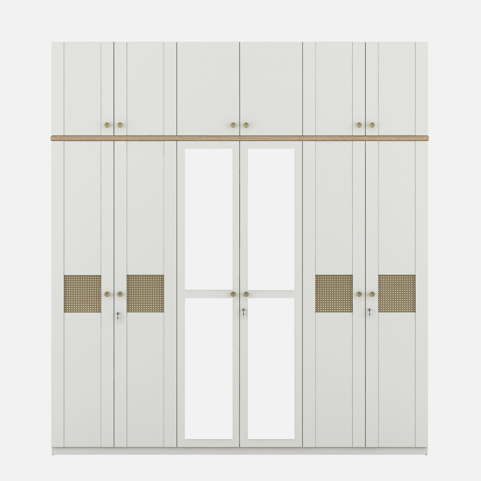 - Lilly 6 Door Wardrobe Mirror With Loft - Kingston White is a sleek and functional storage unit designed to offer ample space for organizing clothes, accessories, and personal belongings while maintaining a stylish aesthetic. This wardrobe type is ideal for medium-sized rooms, providing an optimal balance between compact design and spacious storage.