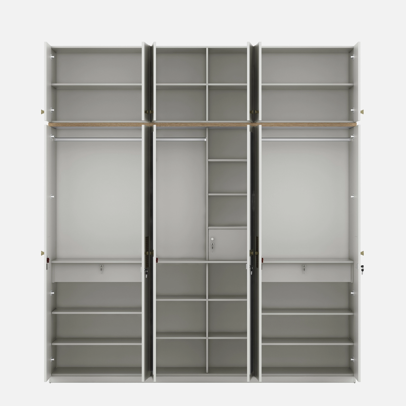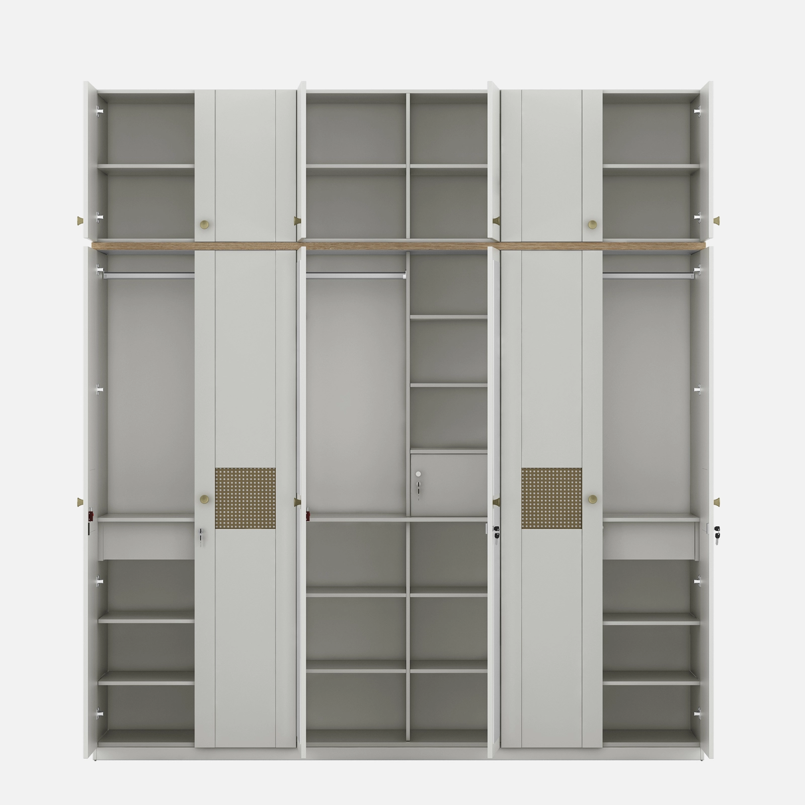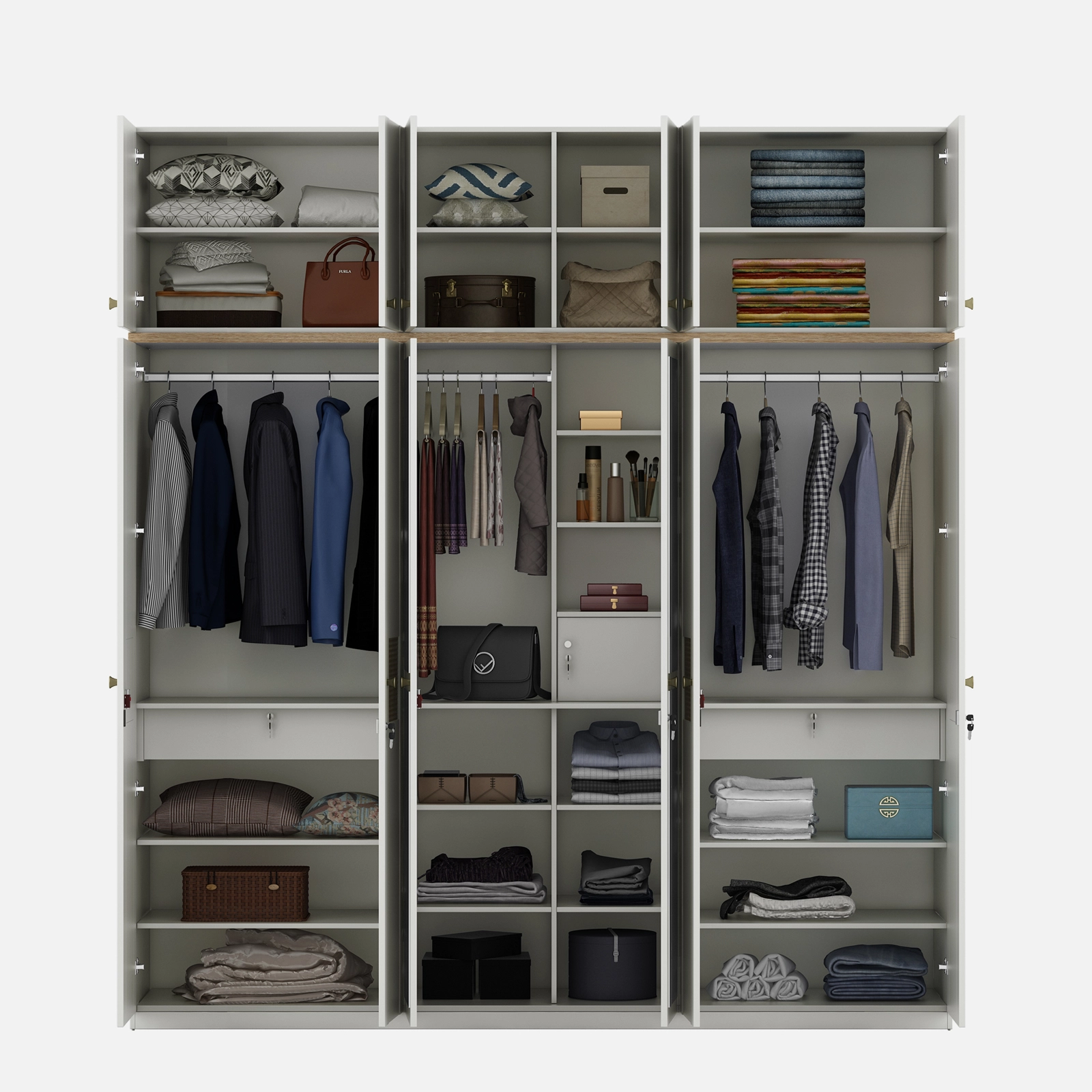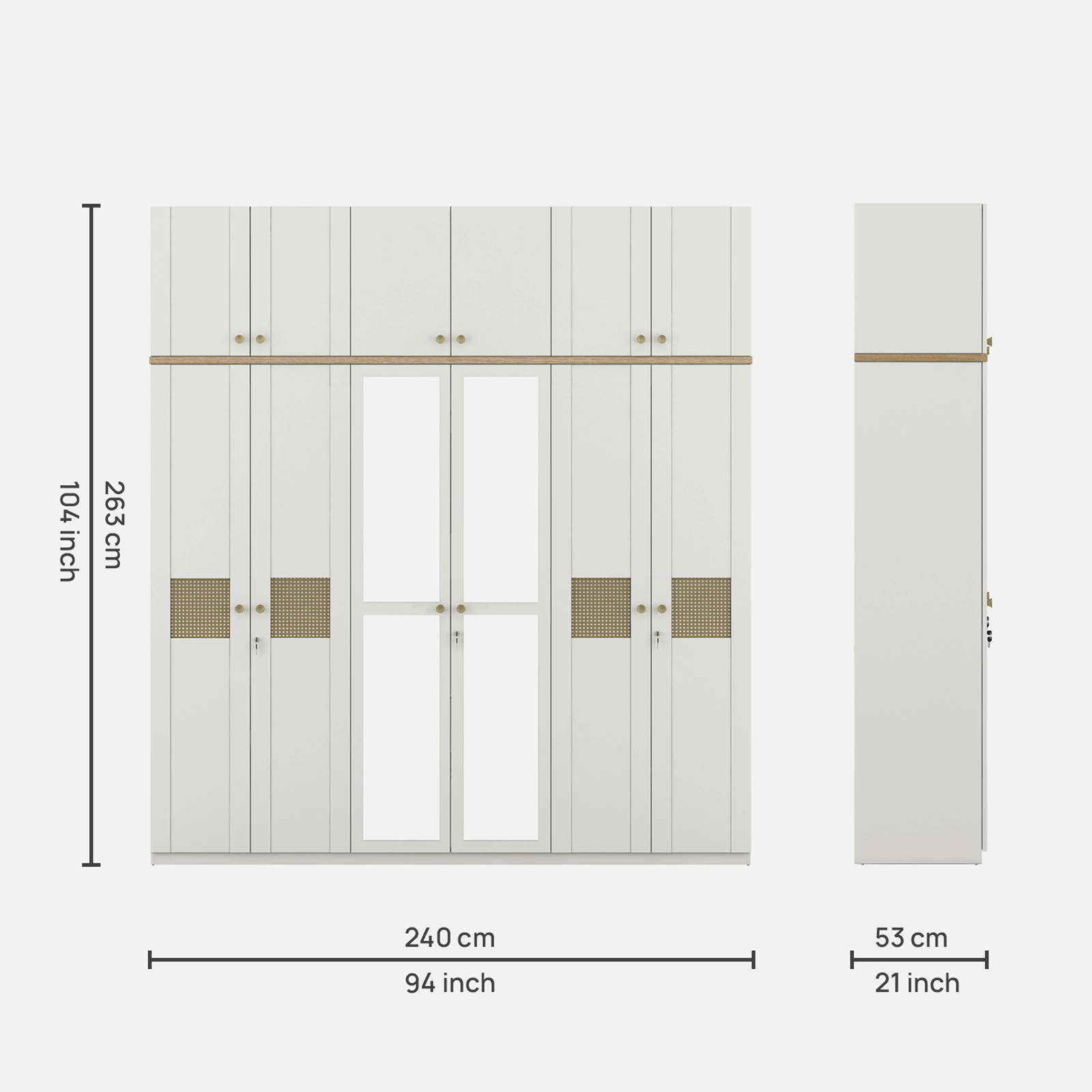 - Lilly 6 Door Wardrobe Mirror With Loft - Kingston White is a sleek and functional storage unit designed to offer ample space for organizing clothes, accessories, and personal belongings while maintaining a stylish aesthetic. This wardrobe type is ideal for medium-sized rooms, providing an optimal balance between compact design and spacious storage.