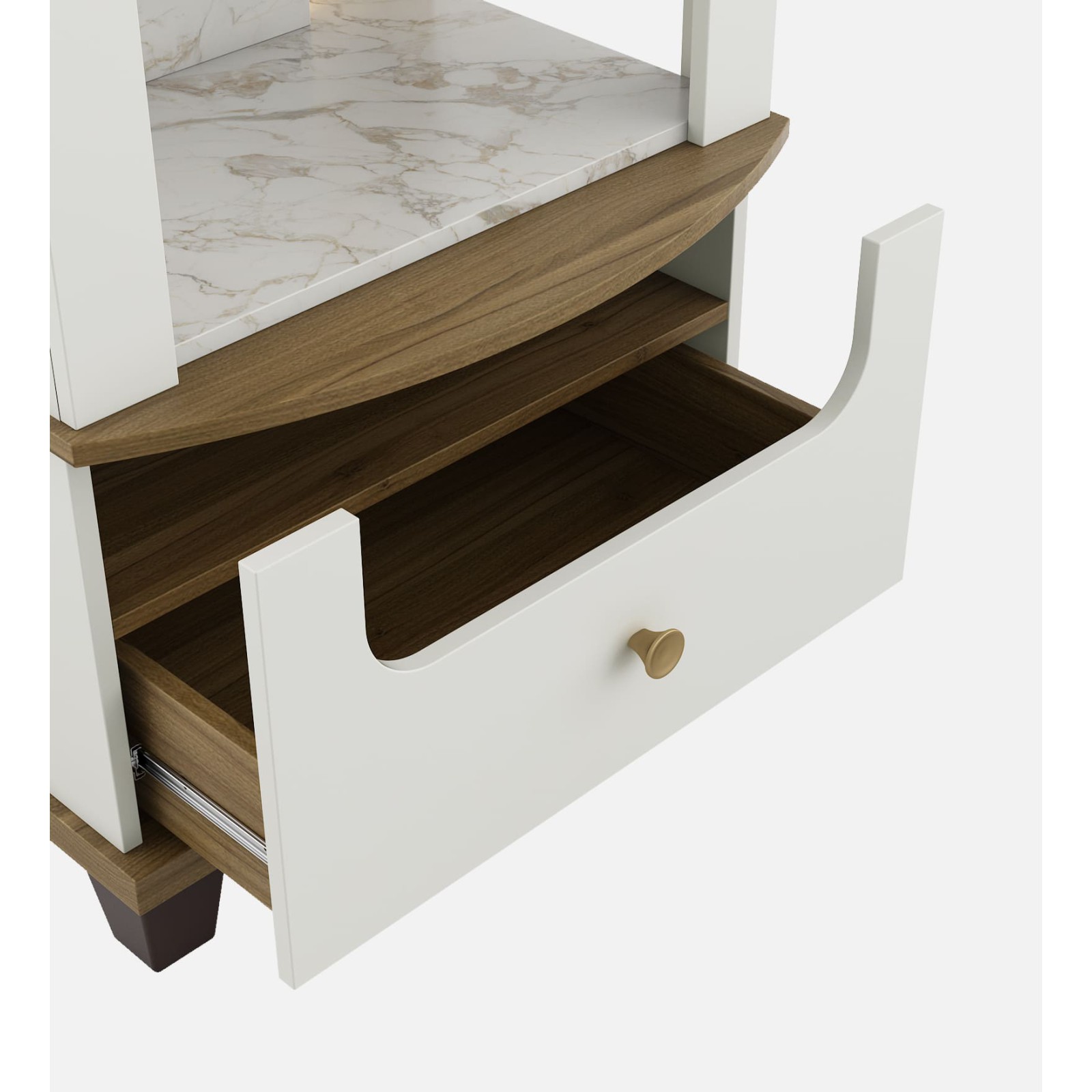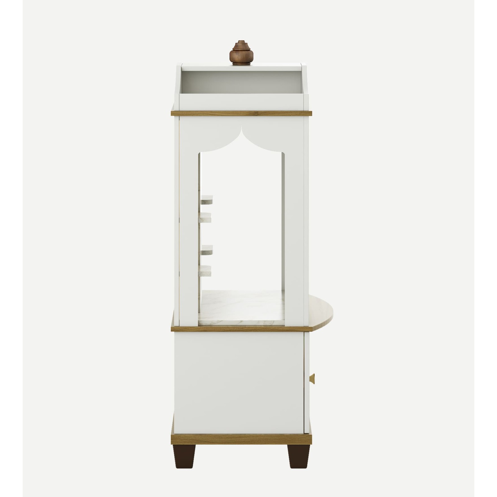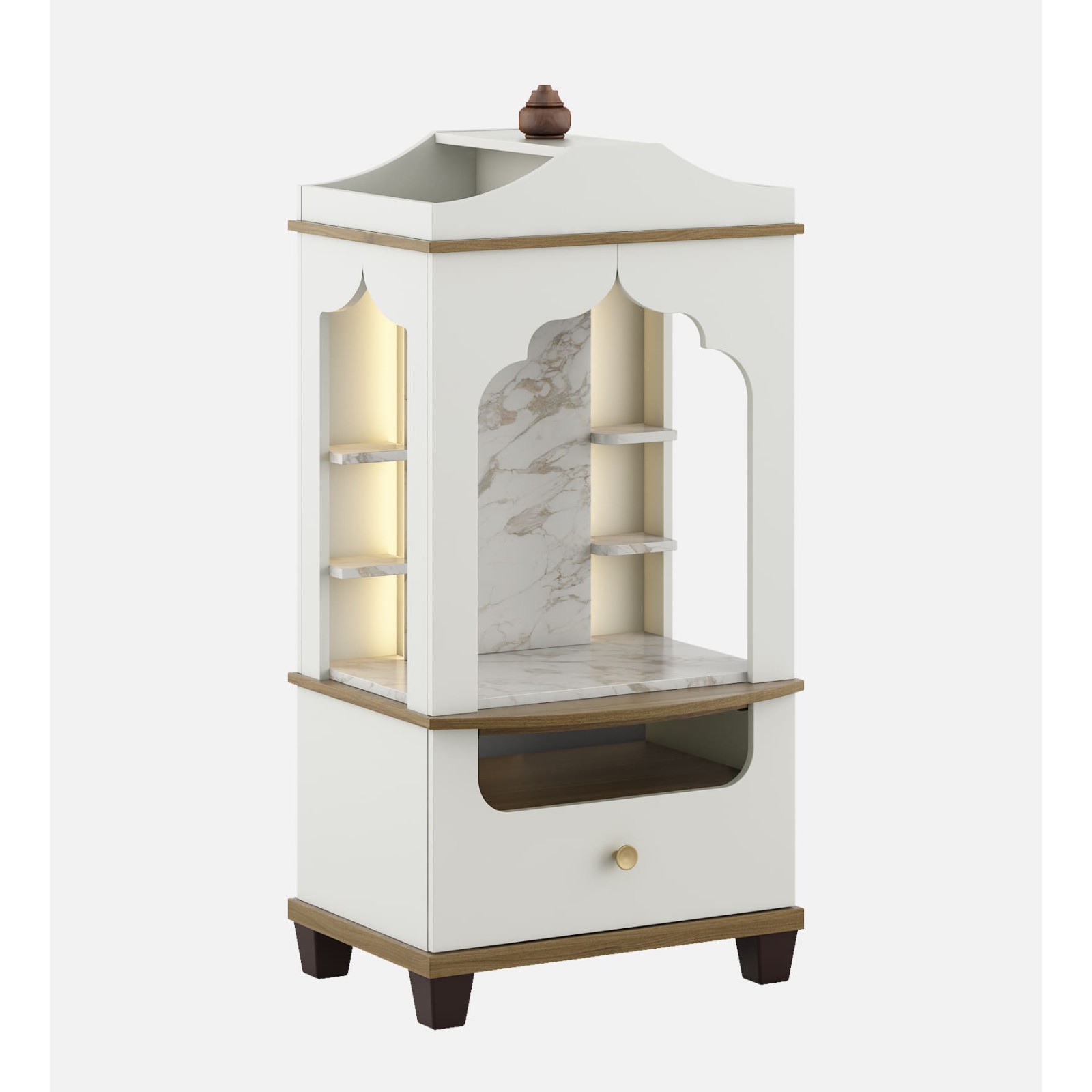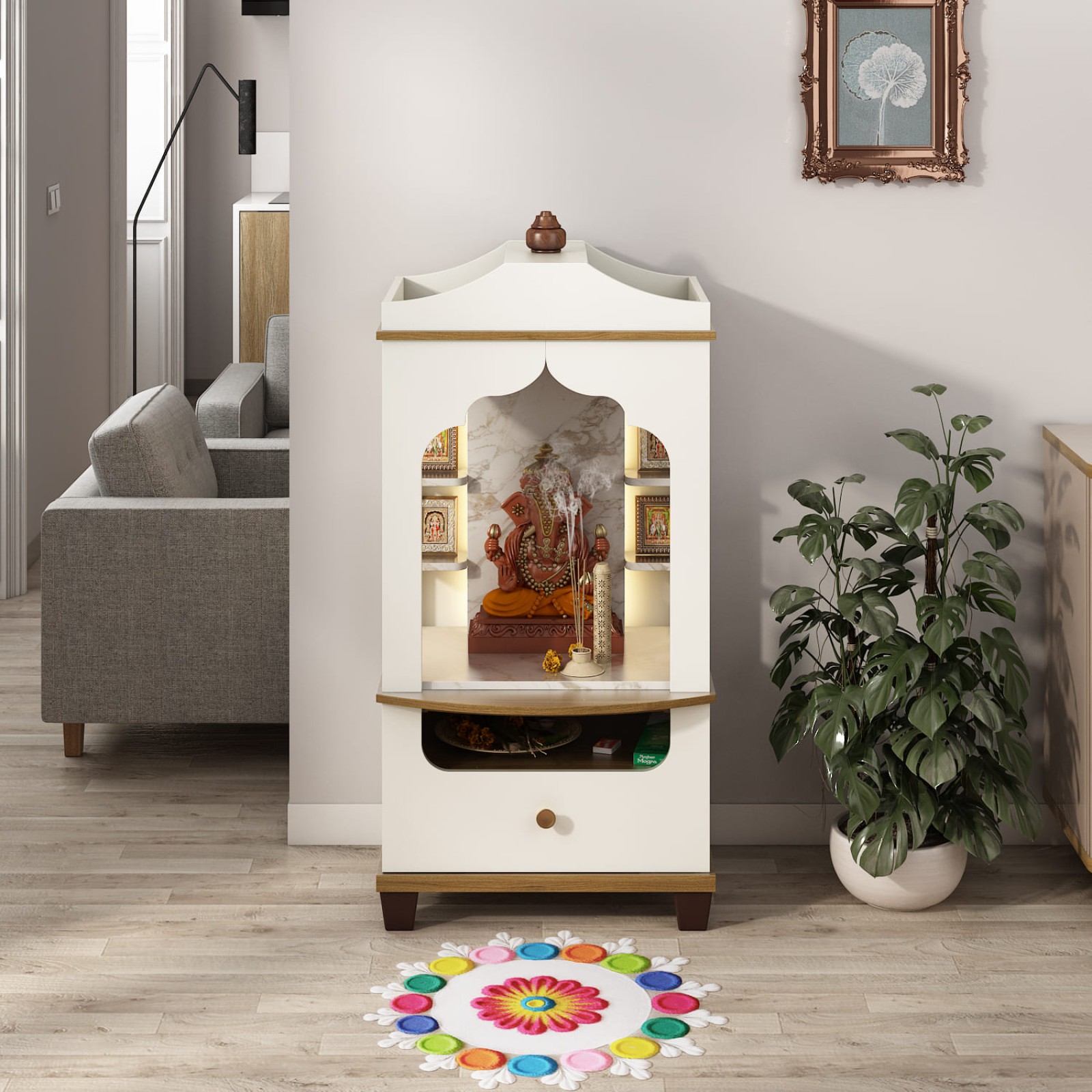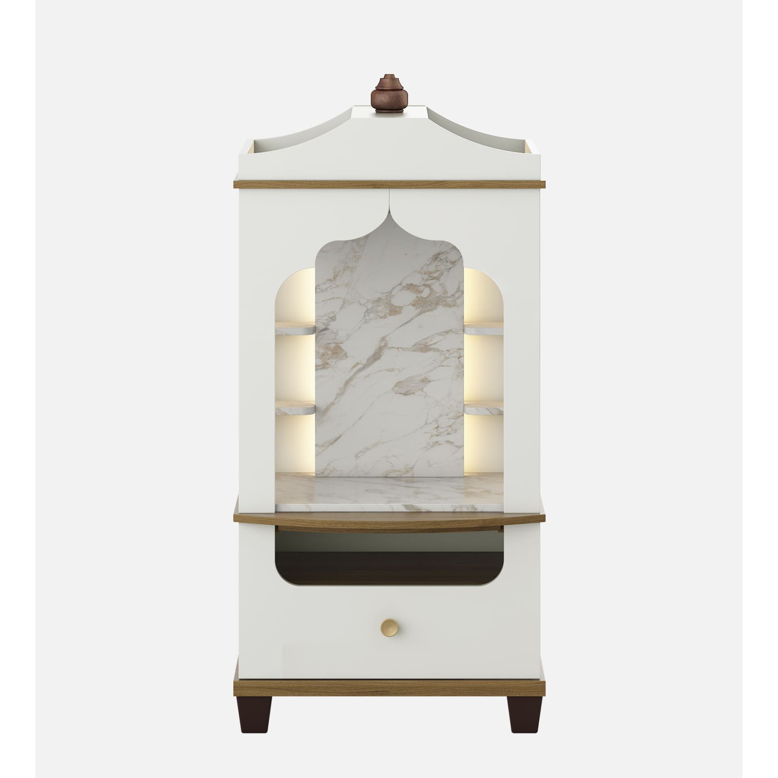 Bring home divinity and serenity with this beautifully designed wooden pooja mandir. Crafted in a clean white finish with contrasting wooden trims, this temple unit features a marble-look back panel and LED-lit side niches to highlight your deities and idols.