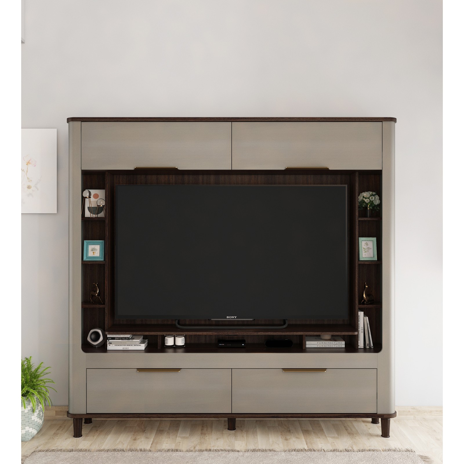 - TV WALL UNIT STARLET - STONE GREY is the ideal combination of fashion and functionality. Its sleek, minimalist style and generous storage for media devices, accessories, and other items make it a great addition to contemporary decor. It is a classic addition to your living area because of its sleek finish and simple lines, which provide a touch of luxury.