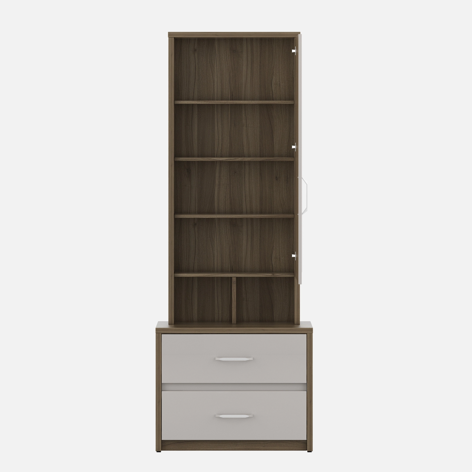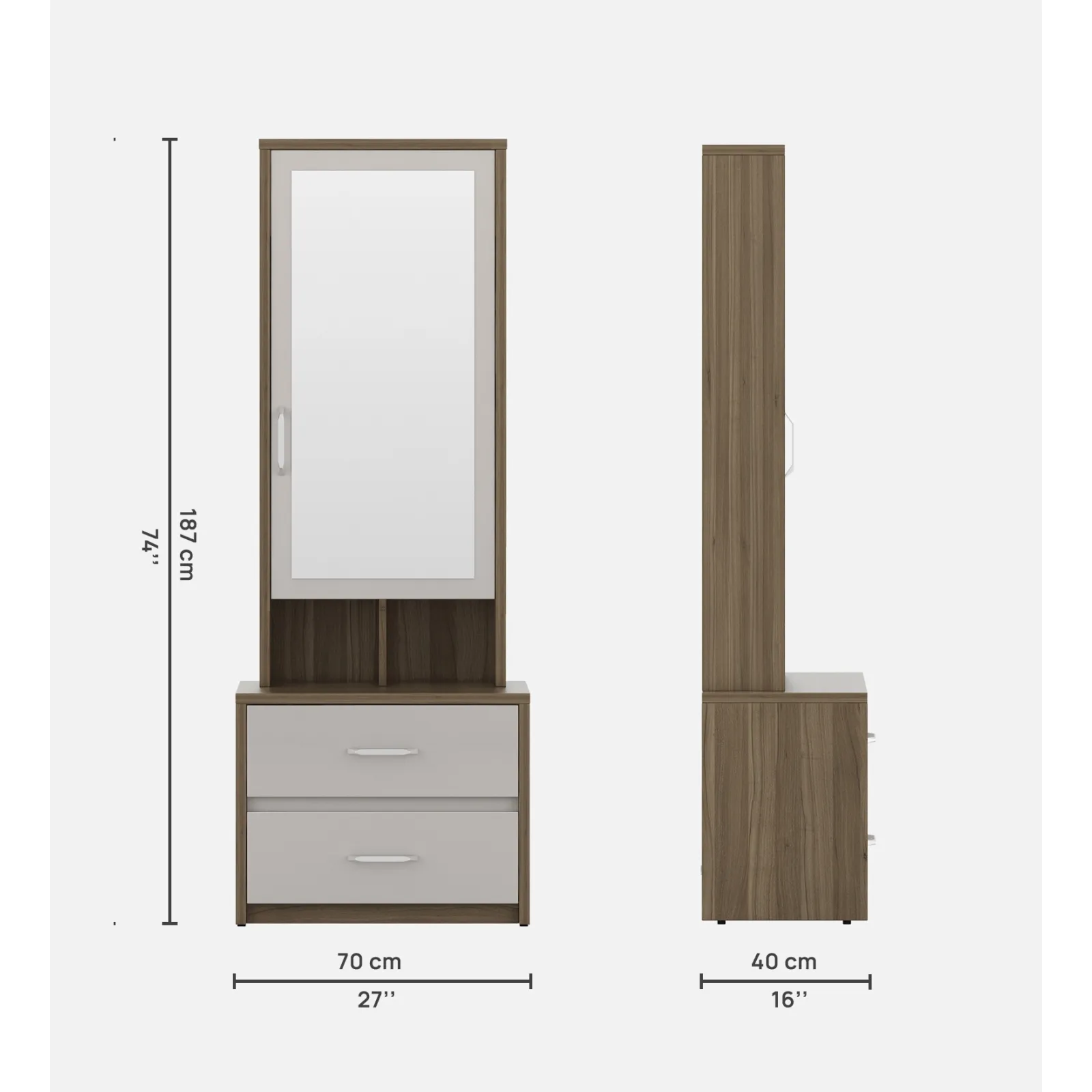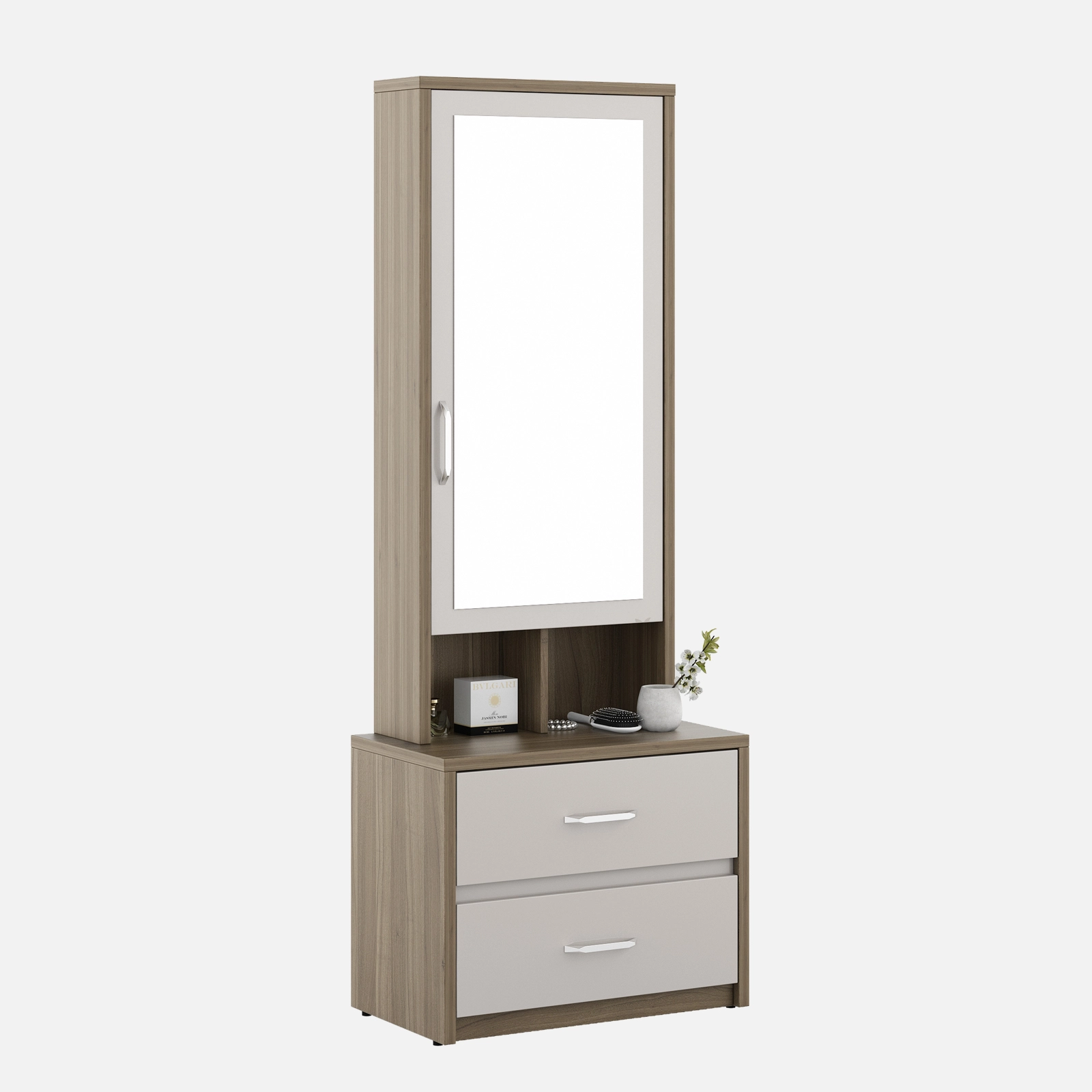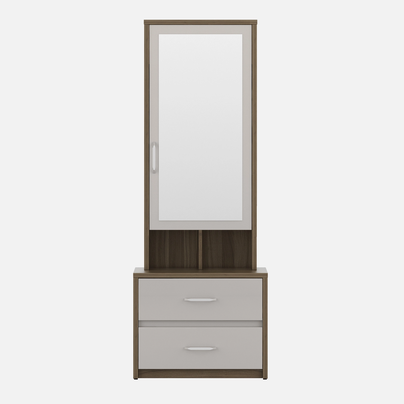 • Nora Dresser Pvc - Lyon Walnut is a seamless combination of utility and aesthetics, designed to elevate your personal grooming space. Featuring a sleek mirror, spacious drawers, and an ergonomic layout, it offers ample storage for cosmetics, accessories, and essentials.